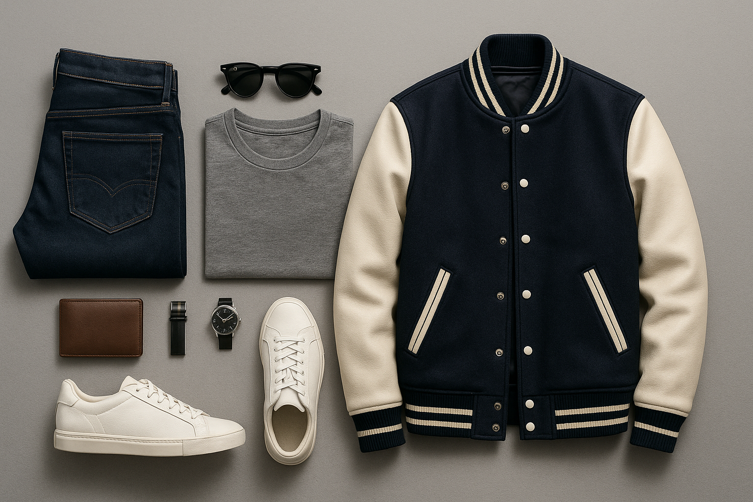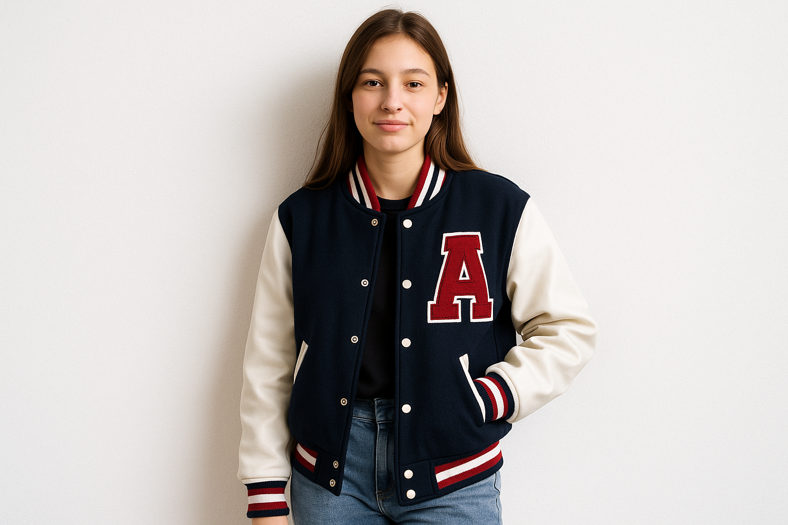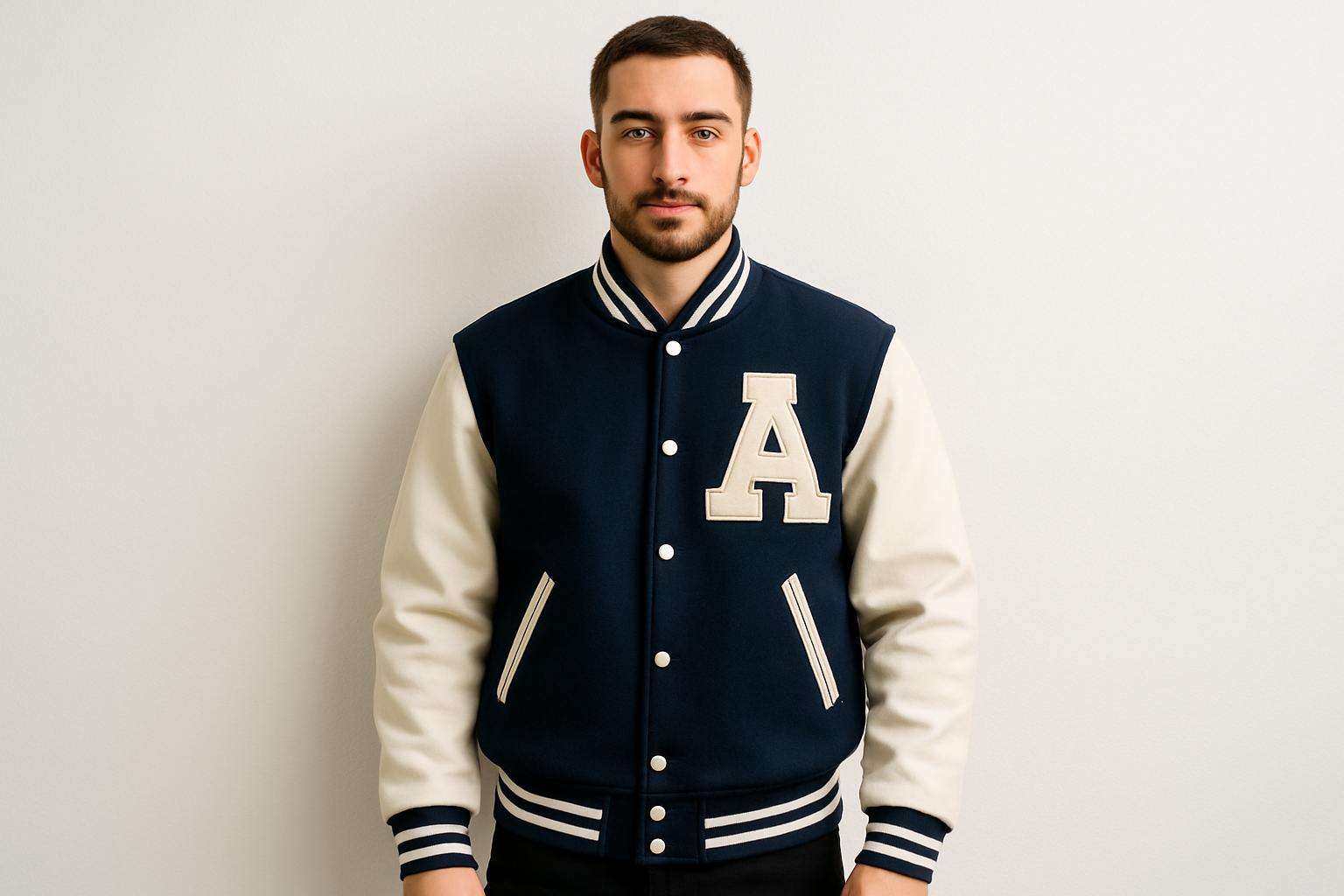 Classic Varsity Letterman Jacket Navy Blue Wool with White Genuine Leather Sleeves and trims