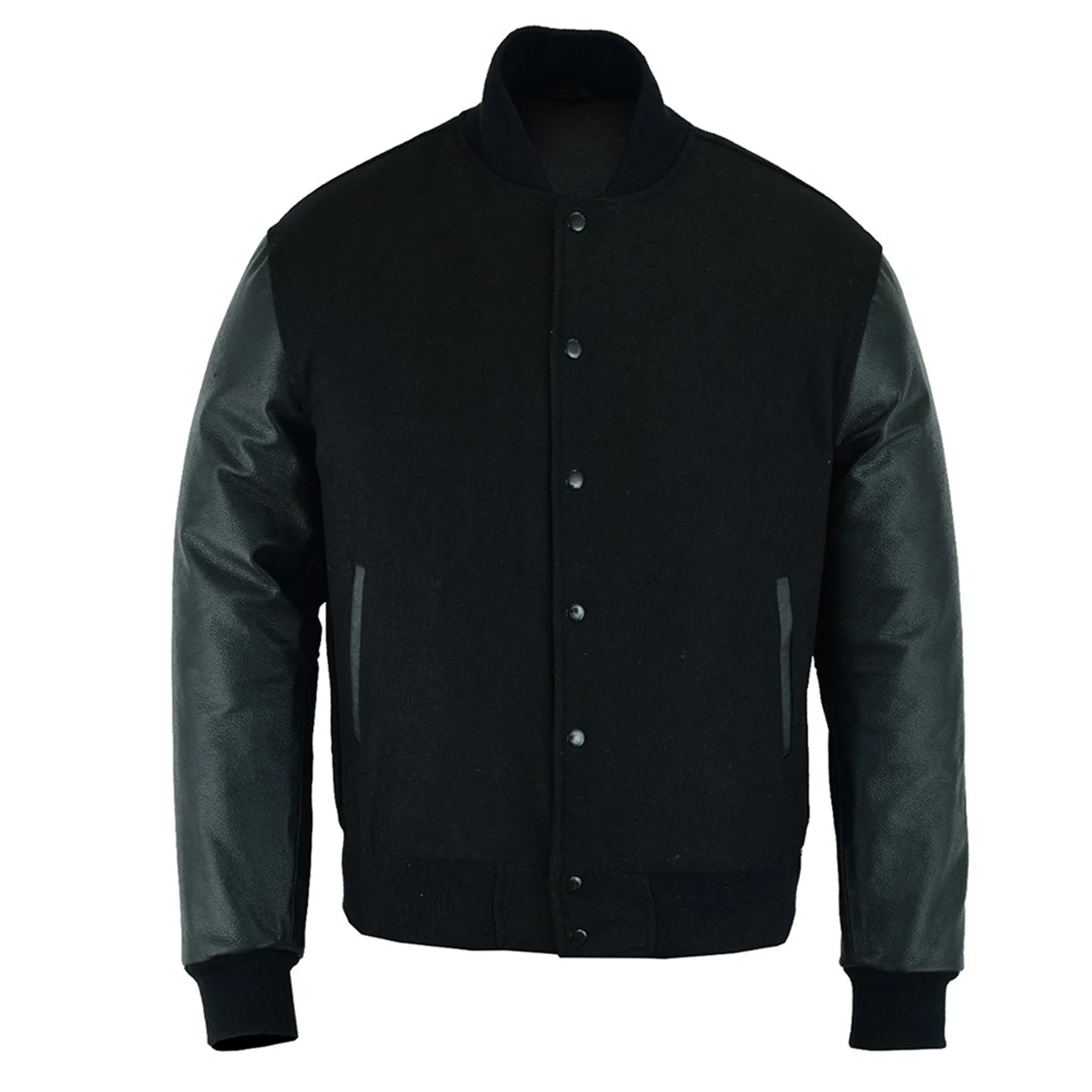 Classic Varsity Letterman Jacket Solid black with Cowhide Leather Sleeves